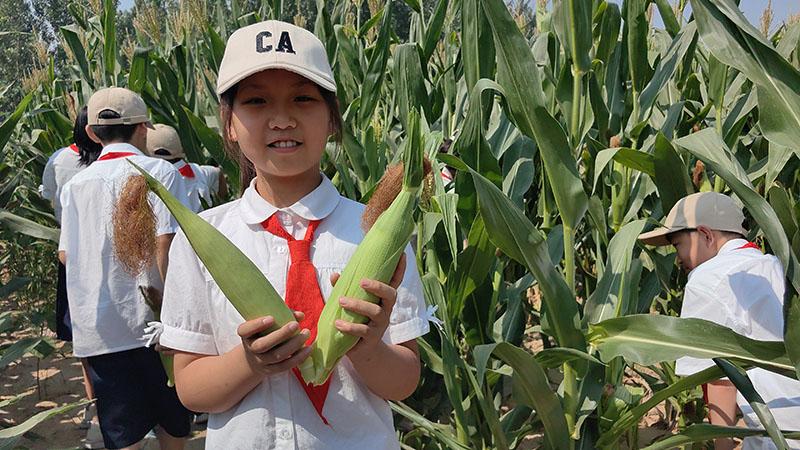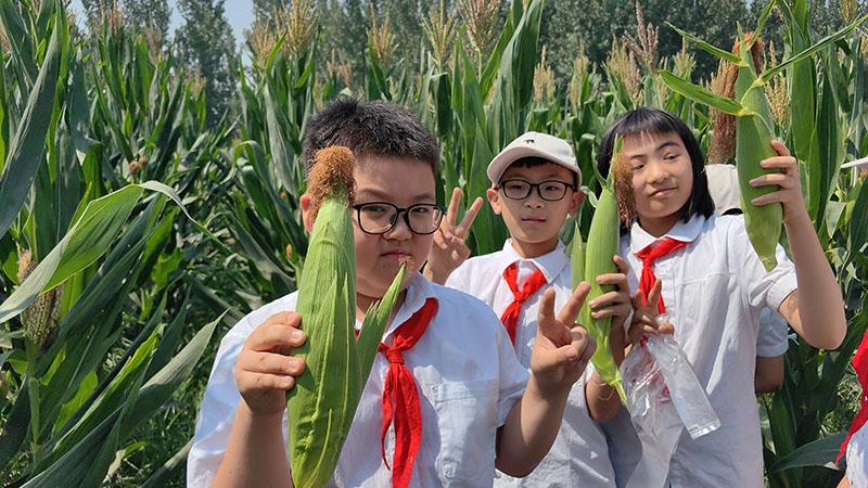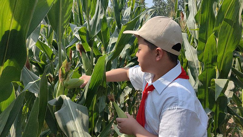 在西瓜地南面,同学们争先恐后地钻进玉米地里,比比哪个玉米更大。经过一番努力,每个人都收获了玉米。